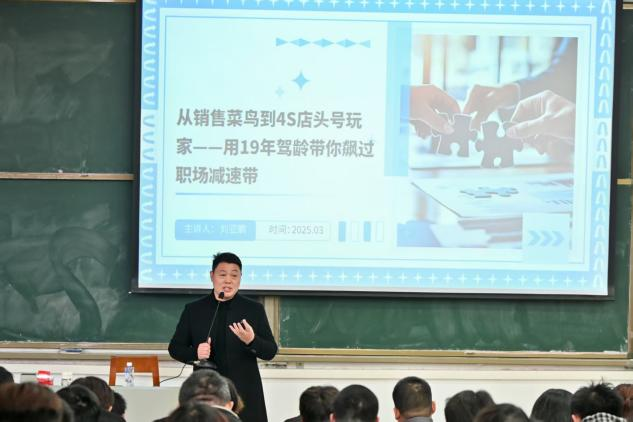 刘亚鹏围绕“人生由我,做自己的规划师”这一主题,为同学们讲述了自己二十年的职业奋斗经历。他通过分享从销售员起步、带领团队逆袭亏损门店到成为比亚迪区域总代理的创业历程,向同学们传达了“沉心深耕,终见破土”的职业理念,鼓励同学们在校期间积极参与行业实践和创新创业项目,锤炼专业素养与市场洞察力。