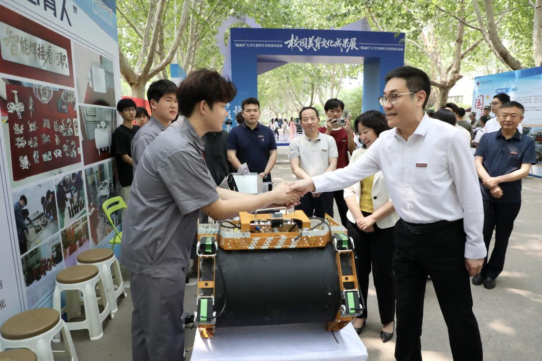 5月28日上午,公司“文化铸魂 科技赋能”校园美育文化成果暨“挑战杯”老员工课外学术科技作品展在校园内隆重举行。公司党委书记厉励,公司党委副书记、董事长夏新颜等校领导亲临现场指导。伟德展示了专业文创产品和部分大赛作品。图为校领导与伟德参展师生亲切交流。