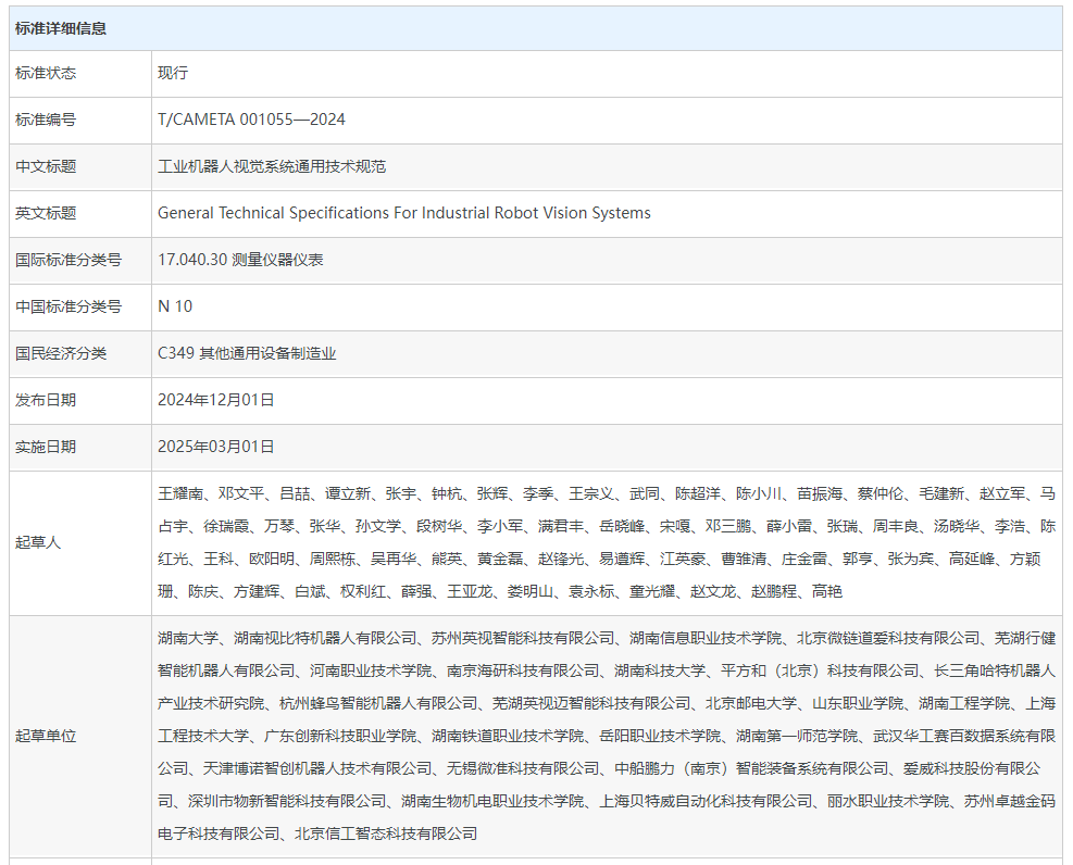 该标准由湖南大学、湖南视比特机器人有限公司等多家单位联合编制,涵盖了视觉数据采集、处理模块功能以及数据通信传输等方面的要求,对工业机器人视觉系统产品的生产和制造具有重要的指导意义。