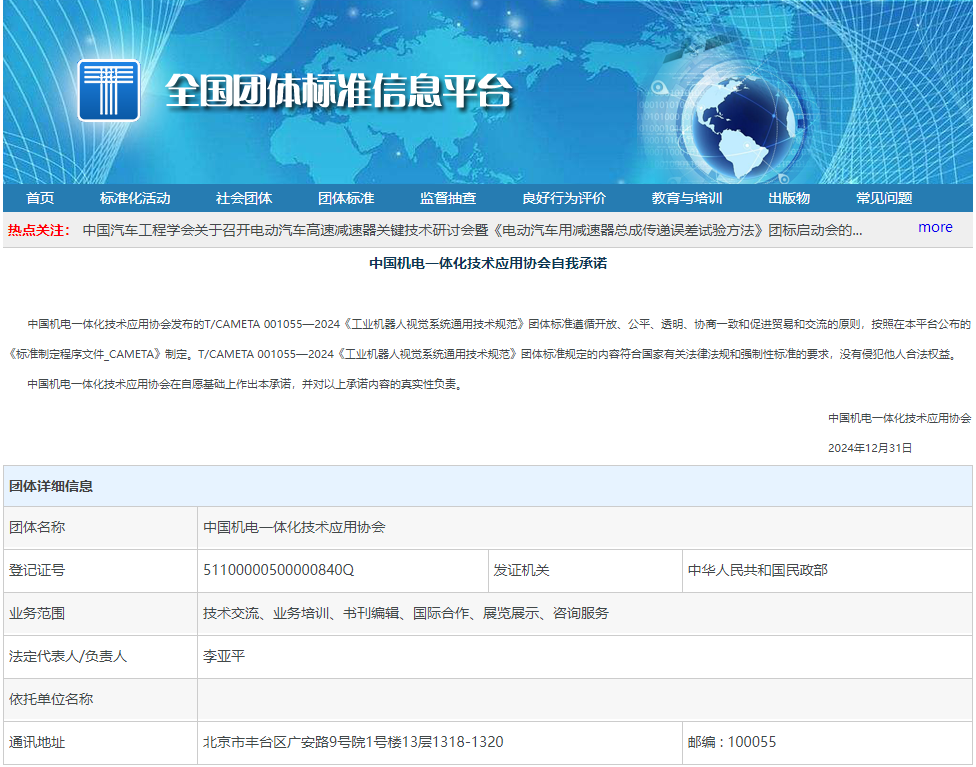 近日,中国机电一体化技术应用协会发布了《工业机器人视觉系统通用技术规范》团体标准(T/CAMETA 001055—2024),该标准将于2025年3月1日起正式实施。伟德武同作为主要起草人参与了标准的制定工作。